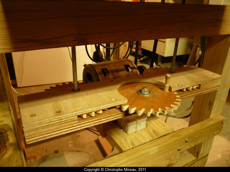 The piano hinge is screwed to an adjustable plate, to be able to set the parallelism with the sanding roll.