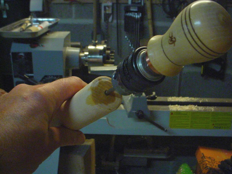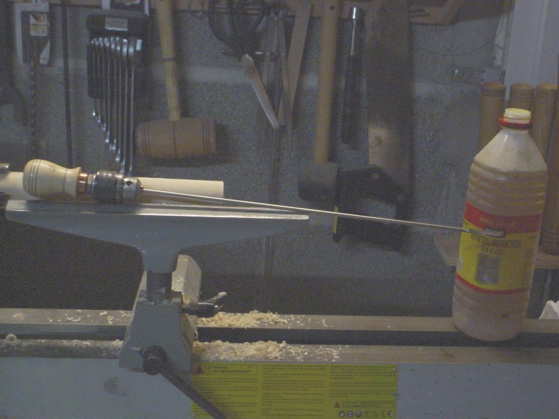 Here a test piece of beech, without using any steady rest. (Stiff enough). The first step is to drill a pilot hole with a short drill bit, as accurate as possible.