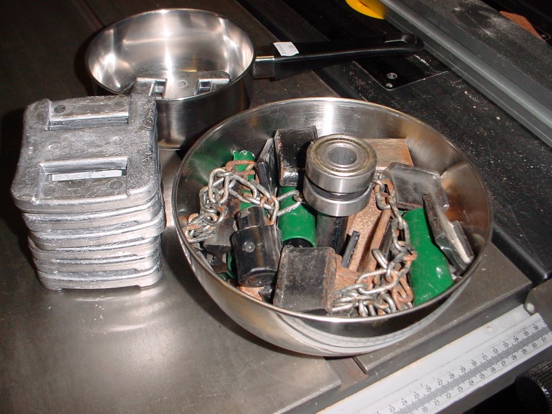 2- The bowl is filled with all sorts of steel scraps, chopped into pieces. In the center, a vertical shaft, on which are mounted the two ball bearings.