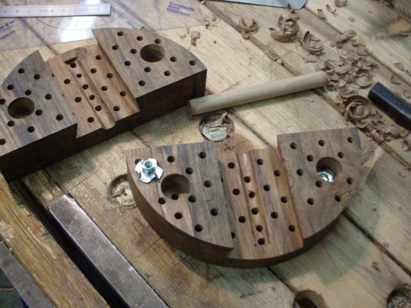 I’ve been inspired for this tool by Jean Santos, French author of the site Gravures et Couteaux . He explains that, back to the 18th century, this tool was made with a cannonball, cut in two pieces. The hemispherical shape actually serves to tilt the vise under whatever necessary angle, in order for the craftsman to work as comfortable as possible.