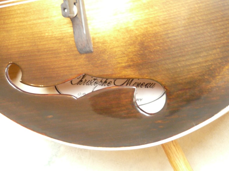 Cette construction s’apparente à la construction des guitares Jazz archtop, à une échelle dimentionnelle moindre, mais la difficulté technique n’est elle pas diminuée, voir augmentée vue les faibles dimensions.