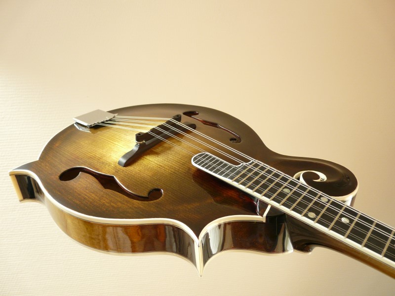 - L’extension de la touche sur la table est amincie, avec des faux frets. En effet, le modèle F5 original est caractérisé par cette extension au dessus de la