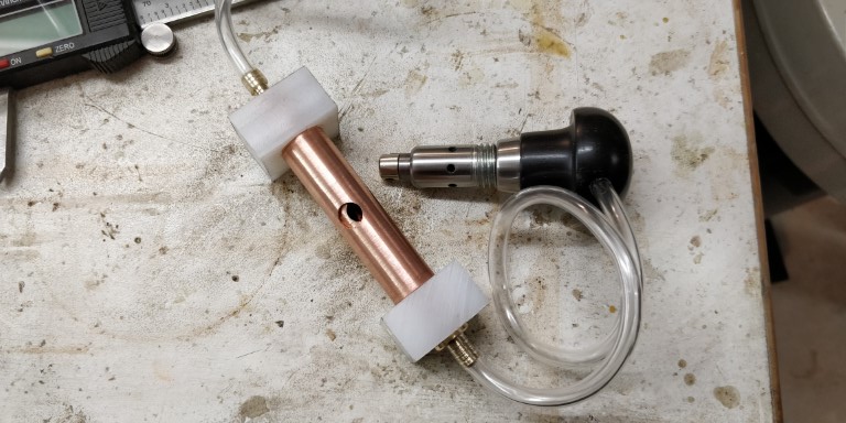 Mécanisme assemblé. Au repos, l’air s’échappe par l’évent.