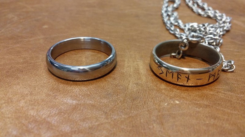 8- A droite, la bague terminée. Le titane supporte très bien le polissage au disque de feutre, finition à la pâte bleue.